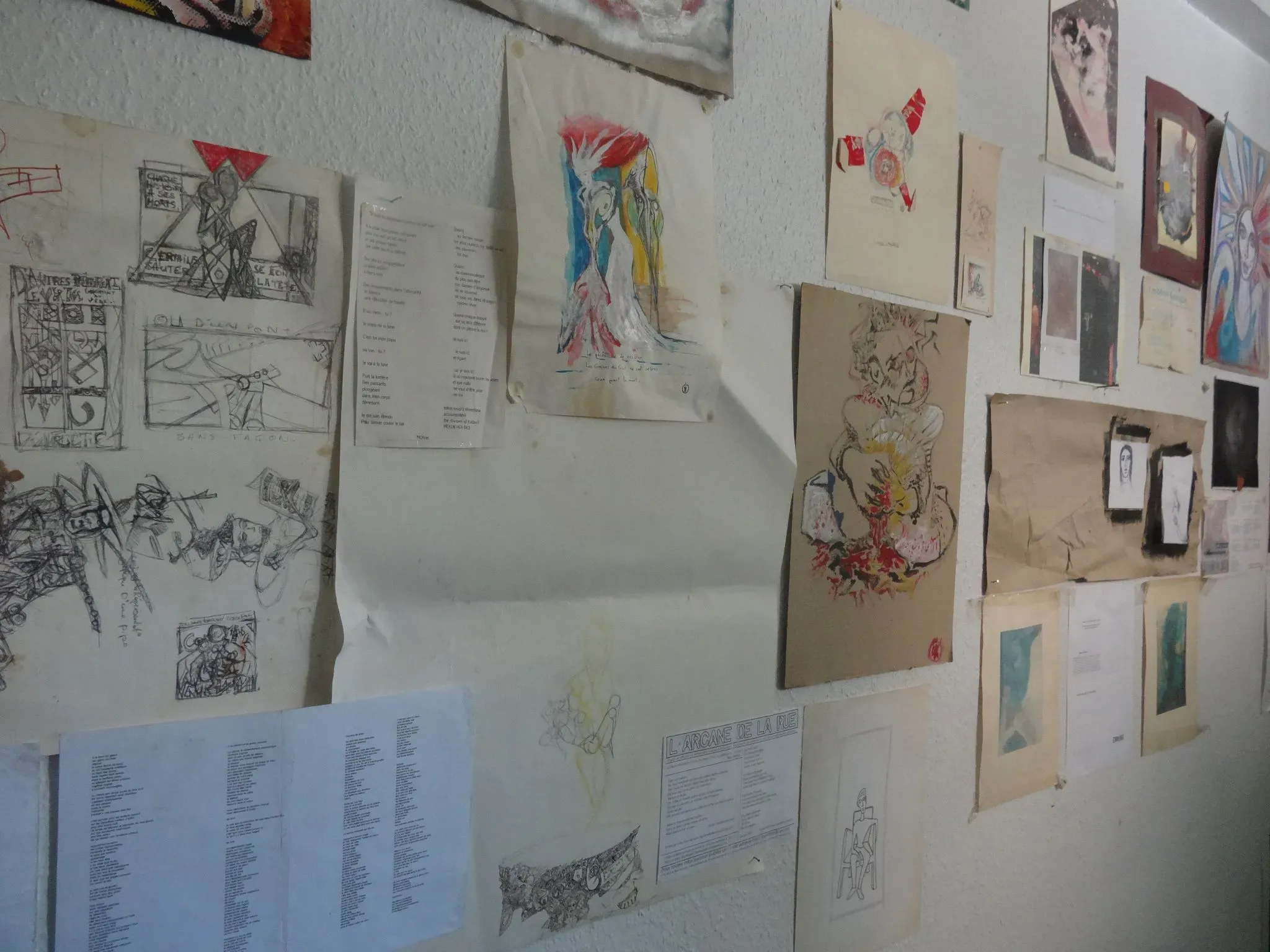 Un mur en évolution continue de fragments de poésie (Morne) mélangés à des rebus de graphismes.