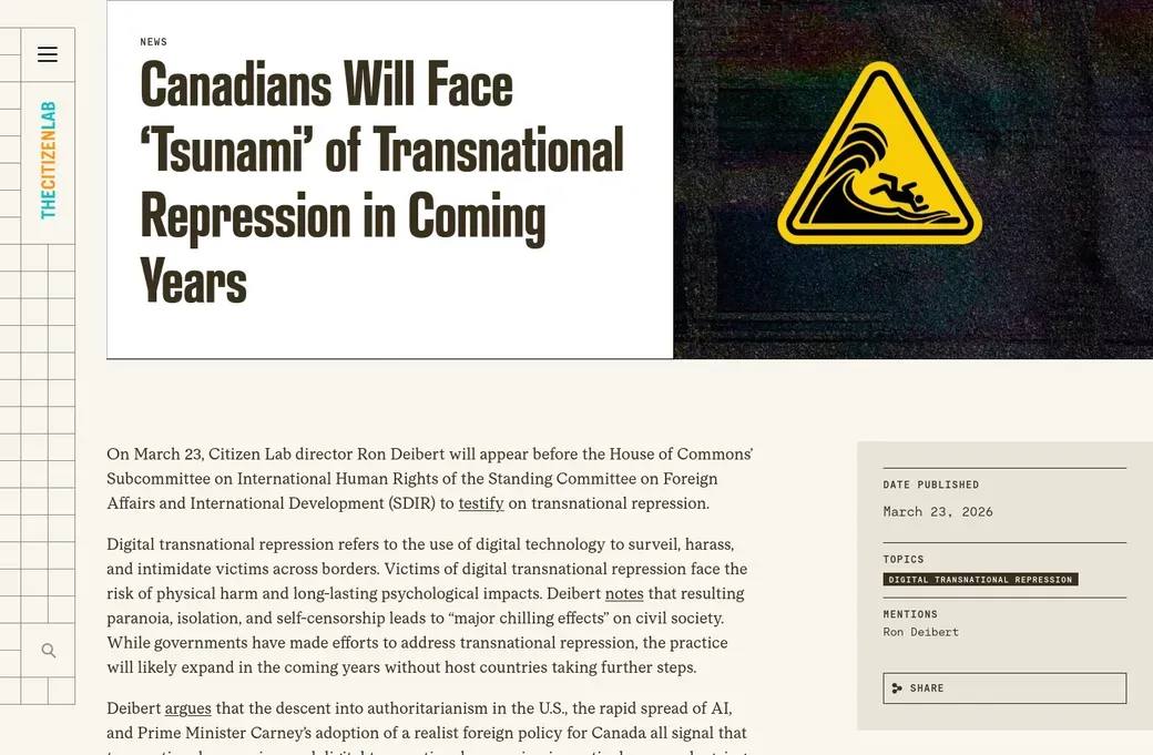 The Citizen Lab sounds the alarm, and argues that the descent into authoritarianism in the U.S., the rapid spread of AI, and Prime Minister Carney’s adoption of a realist foreign policy for Canada all signal that transnational repression, and digital transnational repression in particular, are only going to get worse.