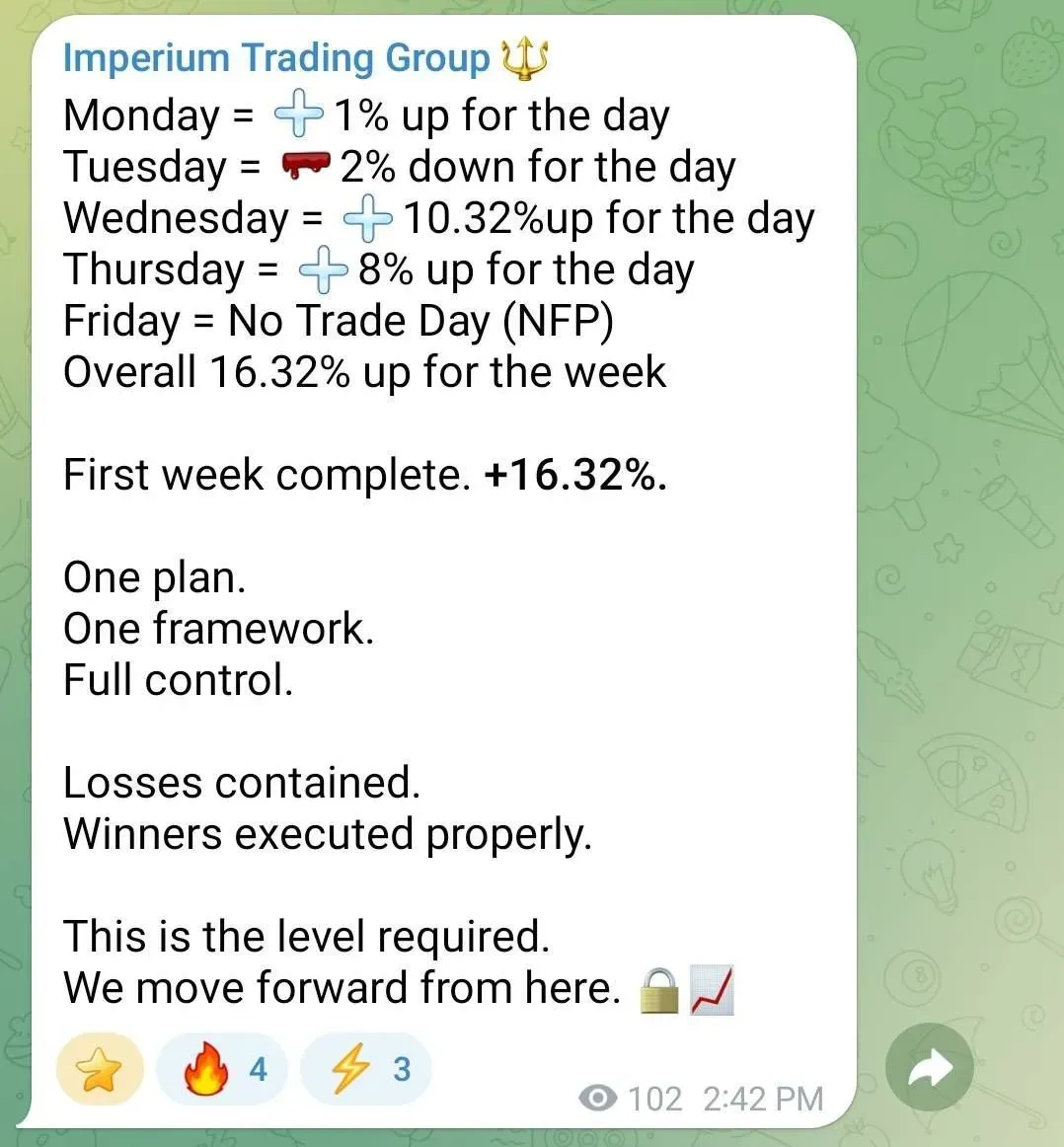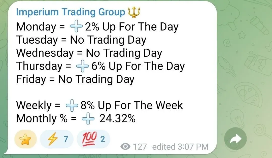 Over the first two weeks, Our Trading Group achieved impressive growth: 16.32% in the first week and 8% in the second week.