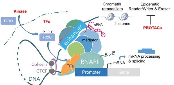 Cancer is in many respects a disease in which cellular transcription is deregulated. Transcription factors are therefore often potent oncogenes that strongly promote the growth of cancer cells. Our strategy is therefore to correct these altered transcription patterns with the help of small molecules. Many transcription factors cannot be attacked directly by small molecules. However, their activity can be indirectly modulated by targeted interventions in their regulation or the underlying transcription machinery.