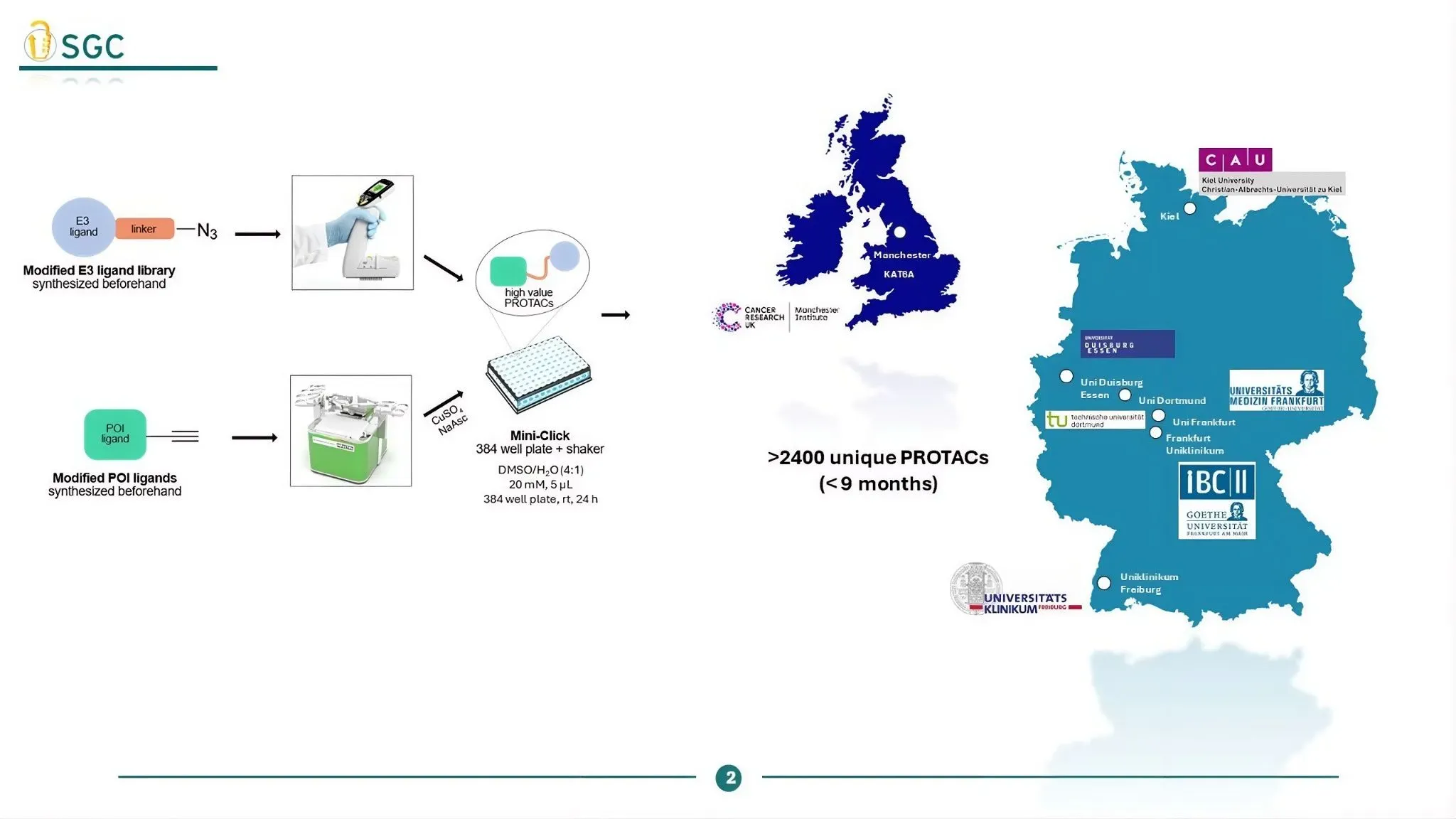 PROTACs are an emerging new pharmacological modality and versatile tools for target validation. However, developing PROTACs requires significant synthetic efforts and screening technology. To enable the rapid development of PROTACs, we developed a modular synthetic strategy based on a 384-well plate and an efficient copper-catalyzed "click chemistry" cycloaddition reaction. We optimized the reaction conditions to achieve nearly complete conversion and adapted them to low volumes (5 µL) to enable rapid "direct-to-biology" (evaluation) . This platform enables the synthesis and evaluation of hundreds of PROTACs within a few days. It facilitates a comprehensive assessment of target degradability, rapid hit identification, and the selection of the most suitable E3 ligase for degrader development. TACTIC welcomes collaboration proposals using this library for drug discovery and target validation projects, contributing to the academic translational oncology community.