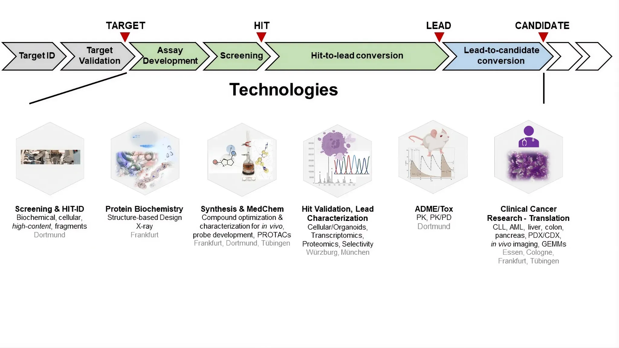 As part of our consortium, we deliberately cover projects at different stages of drug development, utilizing the complementary expertise and technologies at the various sites integrated into TACTIC. Our extensive target protein portfolio includes target structures such as kinases that are well established as drug targets, but also small molecule addressable transcription factors that have ligand-binding structured domains as well as highly innovative target structures such as regulators of chromatin structure and mRNA splicing.